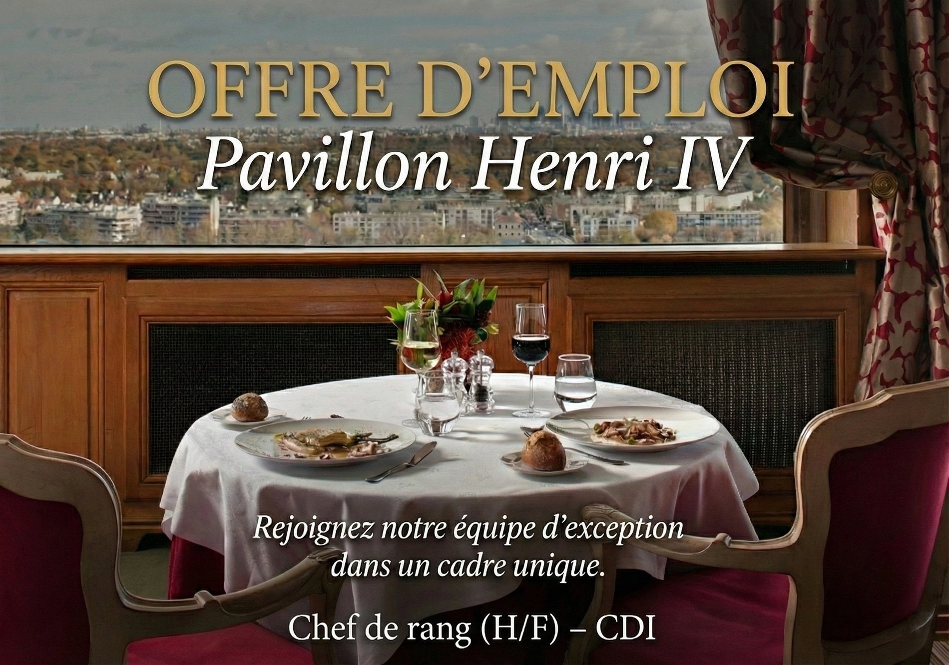 Nichée sur les hauteurs de Saint-Germain-en-Laye, avec une vue imprenable sur Paris, le Pavillon Henri IV, hôtel 4 étoiles et restaurant gastronomique, recherche un(e) Chef de partie dans le cadre du développement de sa cuisine gastronomique.